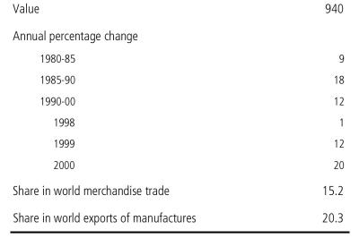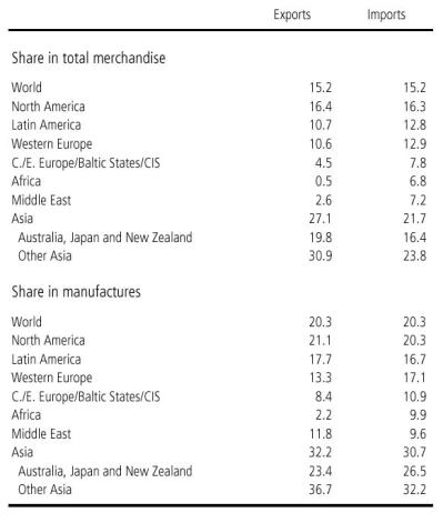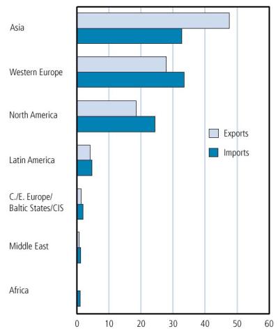 Dem Status der USA als führende informationale Wirtschaftsmacht wird auch die Aufteilung des IuKT-Weltmarktes nach Staaten gerecht. Nach dem „EITO Update 2001“ (European Information Technology Observatory) liegt das Weltmarktvolumen für den IuK Sektor bei 4207 Mrd. DM in 2001. Davon besetzen die USA 36 %, Europa (inkl. Osteuropa) 29 %, Japan 11% und die übrigen Länder 24 %. Eine Besonderheit der IuKT-Märkte zeigt sich in den Zahlen der WTO zu den Anteilen der Weltregionen an Herstellung und Handel von Büro- und Telekommunikationsausrüstung bei Im- und Export (vgl. Tab.4 und Abb.6). Die USA sind zwar die führende Marktmacht im IuKT-Bereich. Die stark modularisierten und standardisierten Teile, die zur Herstellung von Hardware weltweiten Einsatz finden, werden jedoch zu einem großen Teil in Asien hergestellt. Der aktuelle Marktführer im PC-Segment DELL beispielsweise baut seine Rechner in den USA zusammen. Die Einzelteile aus denen diese Rechner bestehen stammen aber nicht aus eigener Fertigung, sondern werden in einem hochentwickelten Zuliefersystem „just-in-time“ von daher bezogen wo sie günstig zu haben sind. „DELL baut nichts selbst. Alle Komponenten kommen von anderen Herstellern. ‚Es lohnt sich, die Investitionen anderer zu nutzen und sich darauf zu konzentrieren, den Kunden Lösungen und Systeme zu verkaufen’, erklärt Michael Dell in einem Interview (...)“ (Brand Eins 10/2001: S.73).