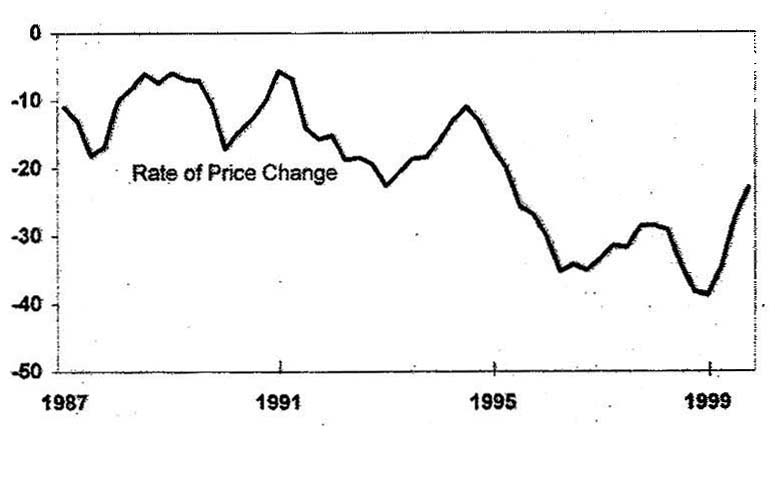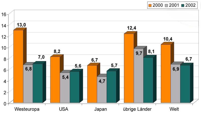 Hier zeigt sich der globale Charakter der IuKT-Märkte. Lokale Preise, Margen und Mengen ändern sich täglich unter dem Einfluss des Wettbewerbs multinationaler Konzerne auf globaler Ebene. Die bedeutende Position asiatischer Wettbewerber ist jedoch nicht auf allein auf japanische Konzerne zurückzuführen Auch die Tigerstaaten und China nehmen in der Herstellung informationstechnischer Produktkomponenten und Peripherie heute eine wichtige Position ein. Dagegen zeigt sich in den sehr niedrigen Anteilen Latein Amerikas, der post-sozialistischen Staaten, des mittleren Ostens und Afrikas die Übertragung des internationalen Handelsungleichgewichtes von industriellen auf informationstechnische Güter und Dienstleistungen. Auch diese ungleiche Verteilung von Wissen und Technologie zwischen den Ländern und Regionen der Welt wird aus Tab.4 und Abb.6 deutlich. „Thus, the new international division of labour, on the one hand, maintains the trade dominance of OECD countries, particularly in high-value trade, through technological deepening and trade in services. On the other hand, it opens up new channels of integration of newly industrializing economies in the patterns of international trade, but this integration is extremly uneven, and highly selective“ (Castells 2000, S. 110). Der Wettbewerb um die IuKT Märkte wird sich in der nahen Zukunft noch weiter verschärfen, da diese im Zuge der weltweiten Rezession seit 2001:4 ihre hohen Wachstumsraten der Vergangenheit nicht weiter aufrechterhalten können. Zeigte z.B. der Markt in Westeuropa von 1994 bis 2000 eine stete Wachstumsentwicklung von 7,1% auf 13%, fällt diese für 2001 auf 6,8% zurück (vgl. EITO Update 2001). Dieser Rückfall der Wachstumsrate ist ein internationales Phänomen. Im Gegensatz zu anderen Sektoren ist jedoch kein Stagnation oder gar eine rezessive Marktentwicklung eingetreten. Für 2002 prognostiziert EITO bereits wieder einen Anstieg der Wachstumsrate (vgl. Abb.7).