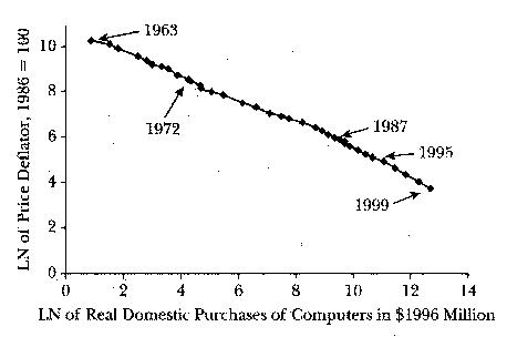 Der Zusammenhang von ständig fallenden Preisen, steigender Anzahl von Computermerkmalen und konstanter Nachfrage ist für ihn die Grundlage der These, dass sich bei der Nutzung der Informationstechnologie fallende Erträge schneller einstellten als bei anderen Technologien. Zwar steigt der Konsumentenmehrwert durch den rapiden Preisverfall, der fallende Schnittpunkt von Angebot- und Nachfragekurve18 auf den informationstechnischen Produktmärkten zeigt jedoch die Tendenz zum Fall des marginalen Nutzens der steigenden Computerleistung (vgl. Gordon 2000: S.62). Die Wurzel der fundamentalen Begrenzung der Nutzung exponentiell steigender Computerleistung (Speicher und Geschwindigkeit) zur Erzeugung von Output- und Produktivitätswachstum liegt in dem konstanten Angebot an verfügbarer Zeit des Individuums. „The cost of computing has dropped exponentially, but the cost of thinking is what it alway was“ (ebd.). Der seit Mitte der 1980er fallende marginale Nutzen der zentralen Anwendungen Textverarbeitung und Tabellenkalkulation ergibt sich demnach aus der exponentiell fallenden Output zu Kapital Rate. Der Anwendungsertrag und damit die sich ergebende Produktivität bleibt durch die begrenzte Zeit und die stagnierenden Anwendungsformen konstant, der Kapitalstock zu ihrer Nutzung hat sich jedoch bis heute verdreißigfacht19. Die Tendenz fallender Investitionserträge der Computertechnologie ist für Gordon der Kern zur Erklärung des Produktivitätsparadoxons. Dadurch ist auch das, u.a. von Castells angeführte, Argument der trägen Diffusion zu Klärung des Computerparadoxon nach Gordons Auffassung widerlegt. Der Vergleich mit der trägen Verbreitung von Innovationen des industriellen Paradigmas, wie elektrischem Licht oder Elektromotor auf Grund hoher Investitionskosten und schlechter Funktionalität, ist wegen der oben aufgezeigten Eigenschaften der Computertechnologie nicht haltbar. „Instead of waiting for the productivity boost to arrive, it is more plausible that the main productivity gains of computers have already been achieved“ (ebd.: S.65). Einen weiteren Grund für fallende Erträge im Computereinsatz erkennt Gordon in der begrenzten Substituierbarkeit von Menschen durch Computer. Viele Tätigkeiten benötigen menschliche Fähigkeiten (Piloten, Fernfahrer, Automobilbau) oder basieren auf zwischenmenschlichem Kontakt (Ärzte, Krankenschart, Rechtsanwälte, Professoren, Banker, Dienstboten, Friseure etc.) und können deshalb nicht durch die Technologie ersetzt werden. Auch die eigentlichen Anwendungen der Technologie bedürfen stets menschlicher Bedienung und genau diese Notwendigkeit erzeugt fallende Erträge beim produktiven Einsatz von Computern (vgl. ebd.). Auch die Innovation des Internet Mitte der 1990er hat den Trend der fallenden Erträge nicht gebrochen. Gordon führt dafür in der Zusammenfassung fünf Gründe an (ebd. S.69ff):