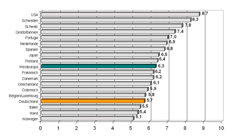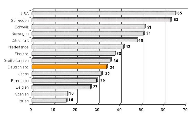Ein ähnliches Bild liefert nach dem „UNICE Benchmarkingreport 2000“ der Umfang der IuKT Ausgaben, gemessen durch ihren Anteil am BIP für 1999 (vgl. Bischoff 2001: S.40). Hier führen wieder die USA die Statistik mit 8,6%, gefolgt von der Schweiz mit 7,2 %. Japan liegt mit 6,9 % hier jedoch vor der EU mit 6,1 % und dem Schlusslicht Deutschland mit 5,1 % und das obwohl der Anteil der IuKT Investitionen in Deutschland am Gesamtvolumen der Ausrüstungsinvestitionen von 14,6 % in 1991 auf 22,9 % in 1999 gestiegen ist (vgl. WSI 2001). Die Investitionsneigung in IuKT wird häufig als ein wichtiger Indikator für den Umsetzungsgrad einer „Wissensgesellschaft“ (diese Begrifflichkeit wird weiter unten diskutiert) herangezogen. „Mit der ‚New Economy’ wird ein vor allem auf den rasanten Fortschritten in der Datenverarbeitung und Telekommunikation basierender höherer trendmäßiger Anstieg der Faktorproduktivität in Verbindung gebracht. Ein solcher Wandel in der wirtschaftlichen Struktur zeigt sich auch in den Investitionen, welche Unternehmen in neue Ausrüstungen tätigen.“ (ebd.). Die hier angesprochene, steigende Faktorproduktivität, die sich aus Investitionen in Informationstechnologien ergeben soll, wird bei der Diskussion zur Produktivitätsentwicklung ein entscheidender Faktor sein und deshalb weiter unten ausgeführt. Die USA werden in Untersuchungen häufig als Leitbild für die Entwicklung einer erfolgreichen Wissensgesellschaft dargestellt, da die positive Produktivitätsentwicklung der USA in den 1990er Jahren auf deren effiziente und breitgefächerte Nutzung der IuKT zurückgeführt wird. Eine ‚Aufholjagd’ der übrigen Wirtschaftsblöcke um die sich nach wie vor entwickelnden Märkte hat begonnen: „Wichtig wird ferner sein, dass Europa den Abstand zu den USA bald verringert, da einen Teil der Gewinne und damit des Wirtschaftswachstums nur das erste Unternehmen am Markt erzielen kann (sog. first mover advantages). Damit fallen dies betriebs- und volkswirtschaftlichen Gewinne vorwiegend in den USA an;“ (Stierle 2001, S.19) Die Position Deutschlands bei dieser ‚Aufholjagd’ ist trotz der gestiegenen Ausrüstungsinvestitionen nicht die Beste. Der Indikator des Verhältnisses von PCs zur Einwohnerzahl zeigt dies deutlich (vgl. Abb.5).
