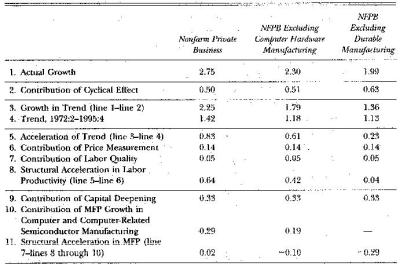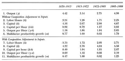 Die Multifaktorproduktivität14 (MFP) ist in diesem Zusammenhang von besonderen Interesse, da sie eine Produktivitätsrate darstellt, die auf den Inputarten Arbeit und Kapital beruht, welche nach ihrem jeweiligen Anteil am Gesamteinkommen des gegebenen Zeitraumes gewichtet sind. Diese ist in den Zeilen 6 und 11 abzulesen. Die Daten ab Zeile 7 basieren auf einer alternativen Form der Faktorerhebung, die strukturellen Veränderungen bei den Inputs Arbeit und Kapital15 berücksichtigt (vgl. Gordon 2000: S.52). Das MFP Wachstum der fordistischen Hochphase 1913 bis 1973 wird zwar von der Rate im Zeitraum 1995 bis 1999, die dem informationalen Paradigma zugerechnet wird, übertroffen. Jedoch hinterfragen Gordon und andere Kritiker diesen Trend. Eine tiefergehende Untersuchung des Produktivitätsanstiegs der 1990er Jahre ergibt demnach, dass die neue Performanz hauptsächlich auf die Entwicklung innerhalb des IuKT-Bereiches selbst zurückzuführen zu sei.