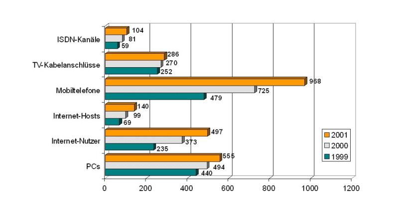 Diese Folgerung stützt auch die Betrachtung der weltweiten IuKT-Infrastrukturentwicklung. Die Verbreitung informationstechnischer Einrichtungen und Geräte zeigt eine steigende Tendenz und ist damit als ein Indikator für den noch andauernden Entwicklungs- und Diffusionsprozess von Informationstechnologien zu interpretieren.