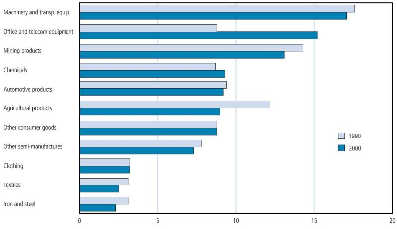 Eine Betrachtung zur Beschäftigung mit anderem Fokus liefert Welsch (vgl. Welsch 2001). Er fasst die Beschäftigungszahlen und –prognosen unterschiedlicher Institute, Verbände und Unternehmensberatungen mit variierenden Branchenabgrenzungen für Deutschland in einem Artikel zusammen. Die Prognosen zu langfristigen Beschäftigungseffekten durch das Rhein-Westfälische Institut für Wirtschaftsforschung sind als Schätzungen einzustufen. Deshalb sollen hier nur die aktuellen Zahlen und kurzfristigen Prognosen der BITKOM (Dachverband der deutschen IuKT-Wirtschaft) und der OECD präsentiert werden. Beide definieren die Abgrenzung des betrachteten Wirtschaftssektors laut OECD wie in 2.1.1 dargestellt und bleiben somit unterhalb des definierten Rahmens einer informationalen Wirtschaft (vgl. ebd.: S.160). Die OECD zählte demnach im Jahr 1997 ein Volumen von 974.000 Arbeitsplätzen im deutschen IuKT Bereich. Davon entfielen 38,3% auf Herstellung von IuKT-Produkten, 22,7% auf Telekommunikationsdienste und 39% auf IT-Dienstleistungen. Damit erreichte der Bereich einen Anteil von 3,1% am Gesamtarbeitsplatzvolumen und liegt somit unter dem OECD Durchschnitt der G7-Staaten von 3,8% im beschriebenen Jahr. Die BITKOM weist für 1999 ein IuKT-Beschäftigungsvolumen von 761.000 und für 2000 von 794.000 Arbeitsplätzen aus. Für 2000 fallen davon 41,5% in den Bereich Software- und IT-Dienstleistungen, 32,4% in den Bereich Fernmeldedienste und 14,5% in den Bereich Büromaschinen und DV-Geräte-Herstellung. Die BITKOM geht von einer Steigerung der Anzahl von IuKT-Arbeitsplätzen im Zeitraum 1997 bis 2000 um 95.000 Stellen (+13,6%) aus. Davon entfallen auf Software und IT-Dienstleistungen 100.000 Stellen (+43%), gefolgt von den Fernmeldediensten mit 36.000 Stellen (+16%). Dagegen steht die negative Entwicklung in den Produktionsbereichen der Branche. Bei der Büromaschinen und DV-Geräte-Herstellung wurden 32.000 Stellen abgebaut (-22%); bei der Herstellung Nachrichtentechnischer Geräte erfolgte ebenfalls ein Abbau von 9.000 Stellen (-9%). Die Zahlen von BITKOM und OECD demonstrieren trotz ihres schmalen Fokus, einen Wachstumstrend der informationalen Kernbranche in Deutschland. Sie weisen jedoch auch darauf hin, dass ein deutlicher, positiver Beschäftigungseffekt zum Ausgleich des Arbeitsplatzabbau in vielen Produktions- und Dienstleistungssegmenten hier nicht zu erwarten ist. Ein Vergleich der beiden Statistiken zeigt die Bedeutung der unterschiedlichen Definitionsgrundlagen auf: Castells weist die allgemeine Tendenz des Bedeutungsverlustes produktbezogener (und damit klassisch industrieller) Arbeit mit seiner Statistik nach. OECD und BITKOM konzentrieren sich hingegen auf die konkrete Arbeitsmarktentwicklung des technischen Kerns der IuKT Branche, der diese Entwicklung durch seine Produkte und Dienstleistungen forciert. Märkte Ein weiterer allgemeiner Orientierungswert für die Bedeutung der Informationstechnologien sind die strukturellen Veränderungen der Produktmärkte und des Welthandels im Zuge ihrer Verbreitung. Der erste Blick soll dabei auf eine längerfristige Entwicklung fallen: die Verschiebung von Anteilen im Weltgüterhandel. Die Weltbank zeigte in ihrem „World Development Report 1998“ einen deutlichen Trend zur Technisierung des Güterhandelsvolumens. Von 1976 bis 1996 hat sich der Anteil primärer Produkte um 21 Prozentpunkte auf 13% und der einfacher Technologien um drei Punkte auf 18 % bei einem gleichbleibenden Ressourcenanteil (11%) verringert. Die Anteile mittlerer Technologien stiegen dagegen um 10 Prozentpunkte auf 32% und die der Hochtechnologien um elf Punkte auf 22% an. Ein Trend zur Steigerung der technologischen Intensität des Güterwelthandels ist auch aus den aktuellen Zahlen zum Anteil der Büro- und Telekommunikationsausrüstung am Welthandelvolumen der WTO in Tab.3 zu ersehen.